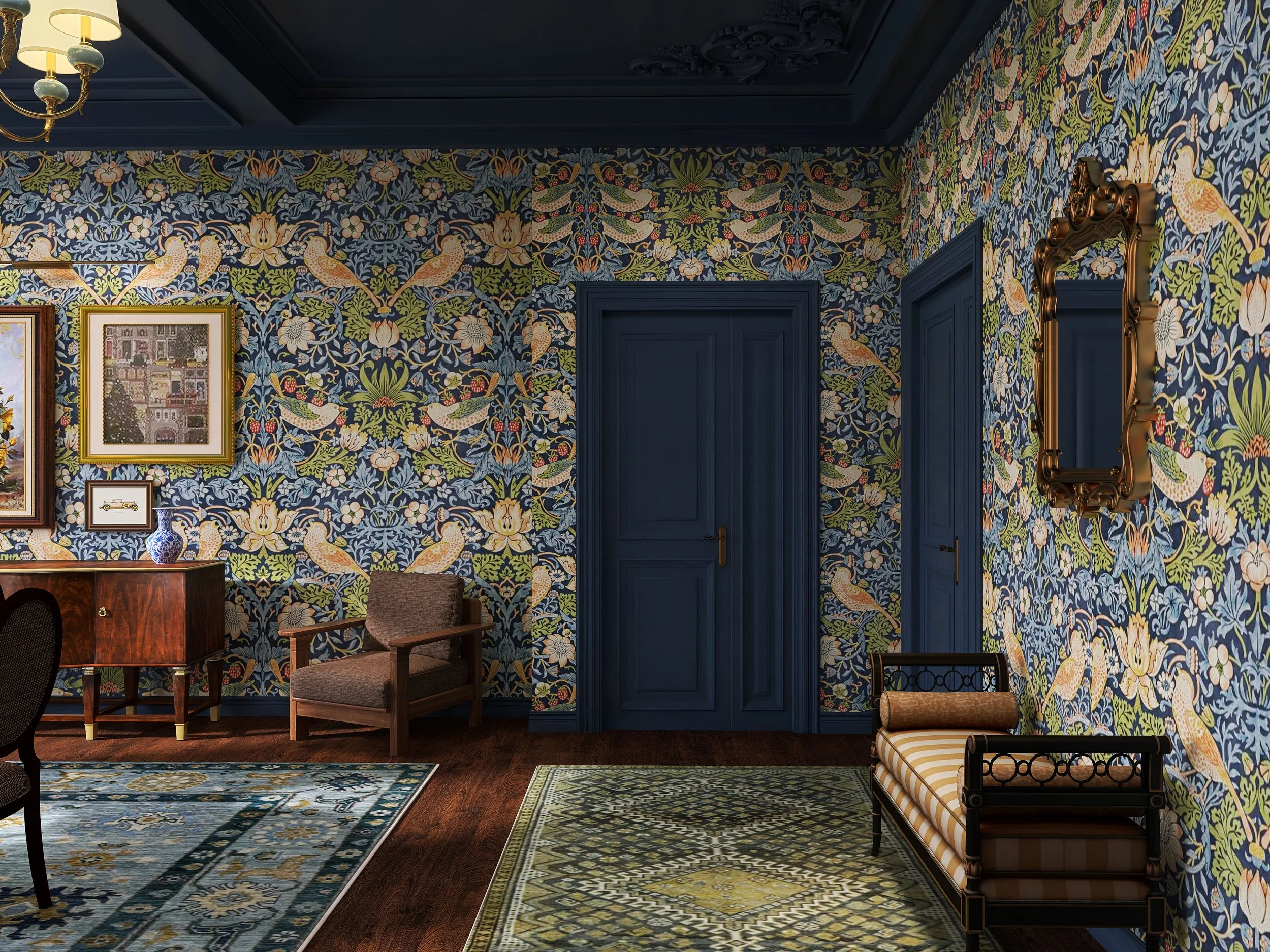 This exquisitely designed room embraces bold blue hues, from the intricate coffered ceiling to the striking window trims, creating a rich, moody ambiance. The walls are adorned with intricate botanical wallpaper, adding a layer of vintage grandeur that pairs seamlessly with the dark wood furnishings.